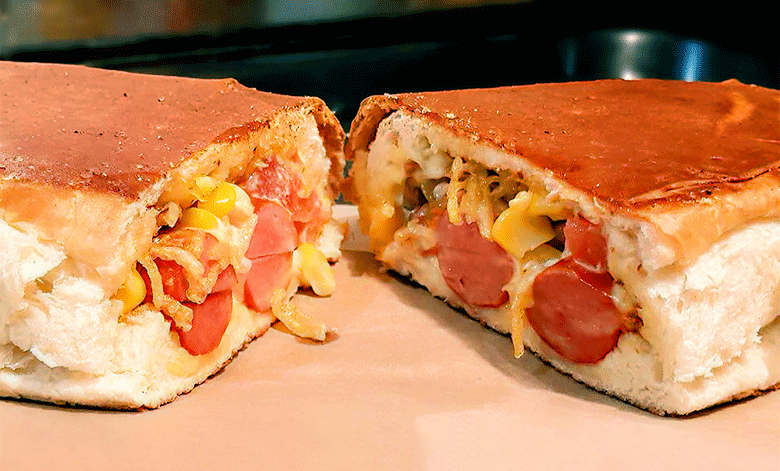 ALDEIA GOURMET: hot-dog prensadão de 23cm com vários ingredientes, em anexo ao Giassi da Santa Bárbara