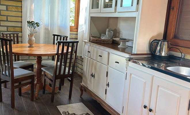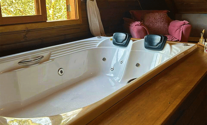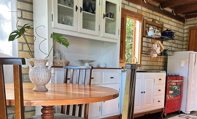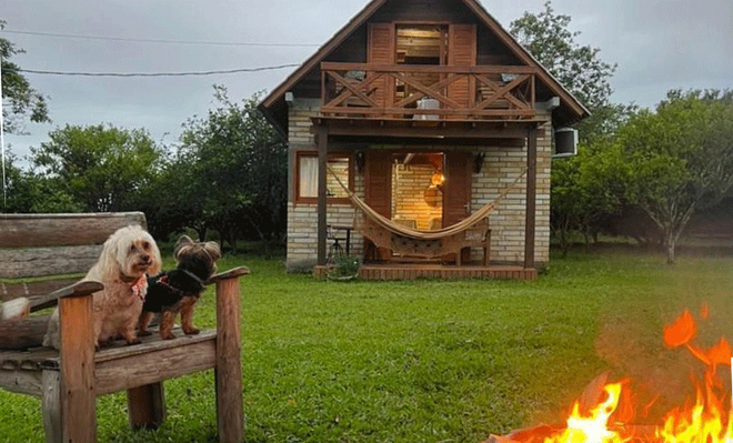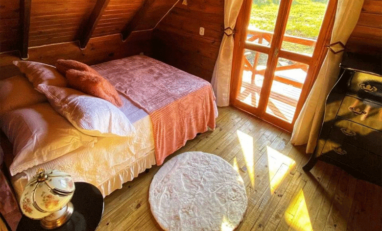 - ACOMODAÇÃO: o chalé conta com dois quartos, sala e cozinha integrada, lareira, banheira com hidromassagem, ar-condicionado, tv smart com acesso a Netflix e churrasqueira externa.
