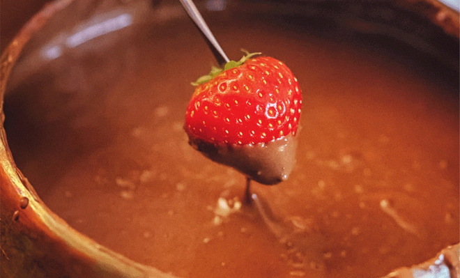 - Para encerrar, o fondue de chocolate preto e branco, acompanhado de frutas frescas da estação e marshmallows. Tudo servido à vontade, garantindo uma experiência completa.