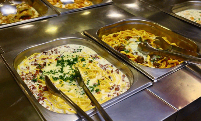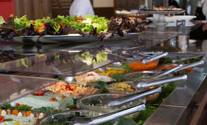 - Além do buffet, saladas, e sobremesas, passam nas mesas: