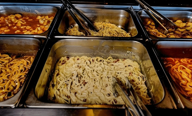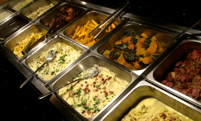 - Buffet livre de saladas, massas, carnes assadas, pratos quentes, pratos vegetarianos e para finalizar buffet de sobremesas, café e chás.
