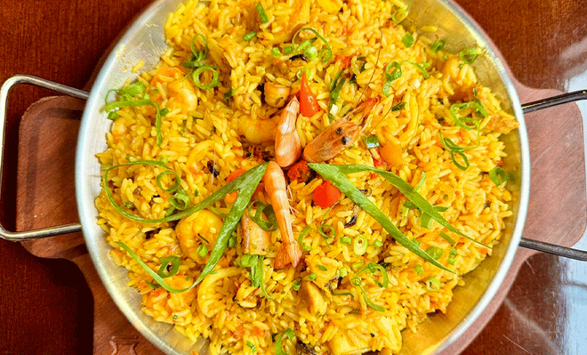 - Paella: frutos do mar temperados com camarão, lula, polvo, siri, marisco e isca de peixe, adicionados ao arroz com um toque de açafrão.