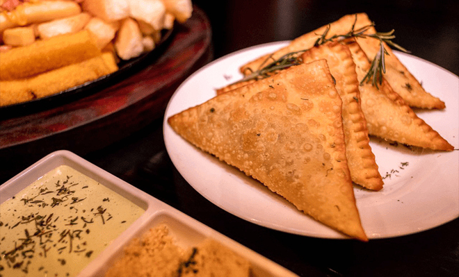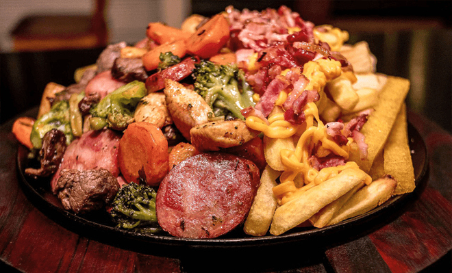 - TÁBUA: 150g de alcatra, 150g de frango, 150g de calabresa, batata com cheddar e bacon, polenta, aipim, brócolis, cenoura e 4 pastéis de carne seca.